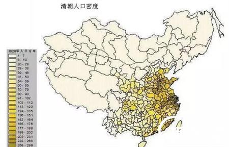 如图所示,清代的人口分布,传统汉地十八行省(孙中山语)一片金黄,而东北、蒙疆、回部、藏区等清王朝的“自留地”,则在长期的封禁下,处于绝对的地广人稀状态。