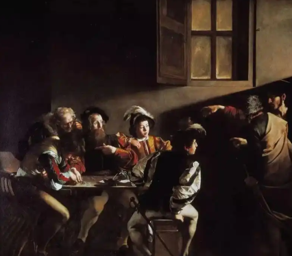 卡拉瓦乔善于运用强烈的明暗对比来营造戏剧性效果。他常常将主体置于明亮的光线中,强调其形象,而背景则常常是深沉的黑暗。这种明暗对比不仅增强了画面的立体感和层次感,还使观众的目光自然聚焦于主体之上。例如,在《圣马太蒙召》中,坤督头上的耀眼光线照亮了他的脸和手,同时也将他的召唤传给了马太。这道光线不仅具有象征意义,还成为连接两组人物之间的桥梁,使画面充满了戏剧性和神秘感。