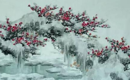 这首诗的首句“闻道梅花坼晓风,雪堆遍满四山中。”写梅花绽放的情景。如第一句中“坼晓风”一词,突出了梅花不畏严寒的傲然情态;第二句中则把梅花比喻成白雪,既写出了梅花洁白的特点,也表现了梅花漫山遍野的盛况。语言鲜明,景象开阔。而三四两句“何方可化身千亿,一树梅花一放翁。”更是出人意表,高迈脱俗,愿化身千亿个陆游,而每个陆游前都有一树梅花,把痴迷的爱梅之情淋漓尽致地表达了出来。